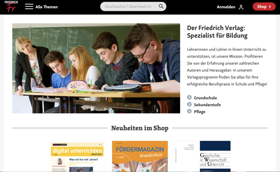 Der Friedrich Verlag ist Spezialist für Bildung. Mit Angeboten zur Unterrichtsvorbereitung und Wissensvertiefung, zum Einsatz im Klassenraum und für das spielerische Lernen und Fördern – in allen Schulstufen und Fächern. Wer Friedrich Zeitschriften liest, spart Zeit bei der Unterrichtsvorbereitung und bekommt qualifizierte Hilfe für den Unterrichtsalltag.